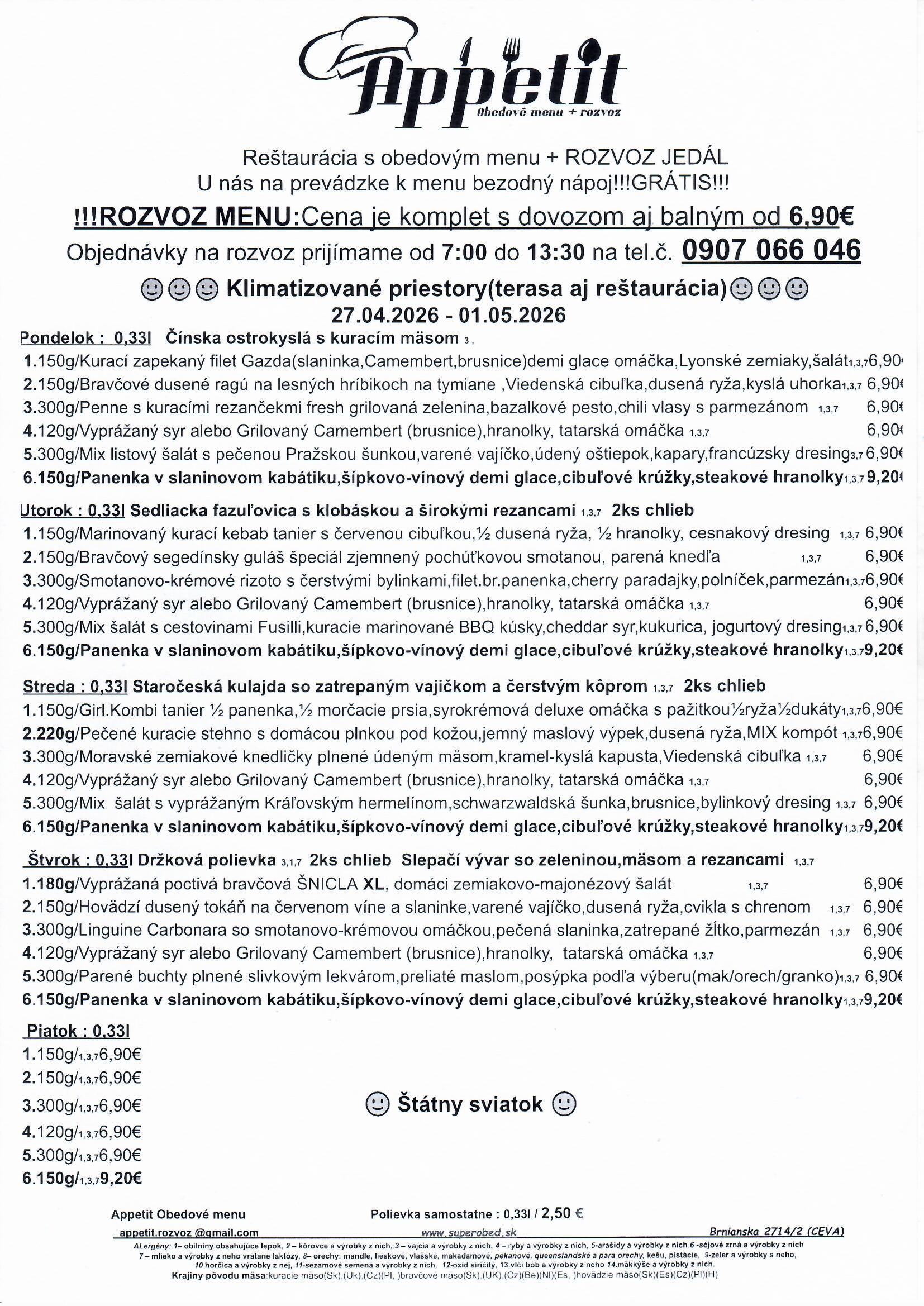 Kategórie: Reštaurácie , Donášky , Catering Zobraziť Dnešné menu 0907 066 046 - ROZVOZ MENU
